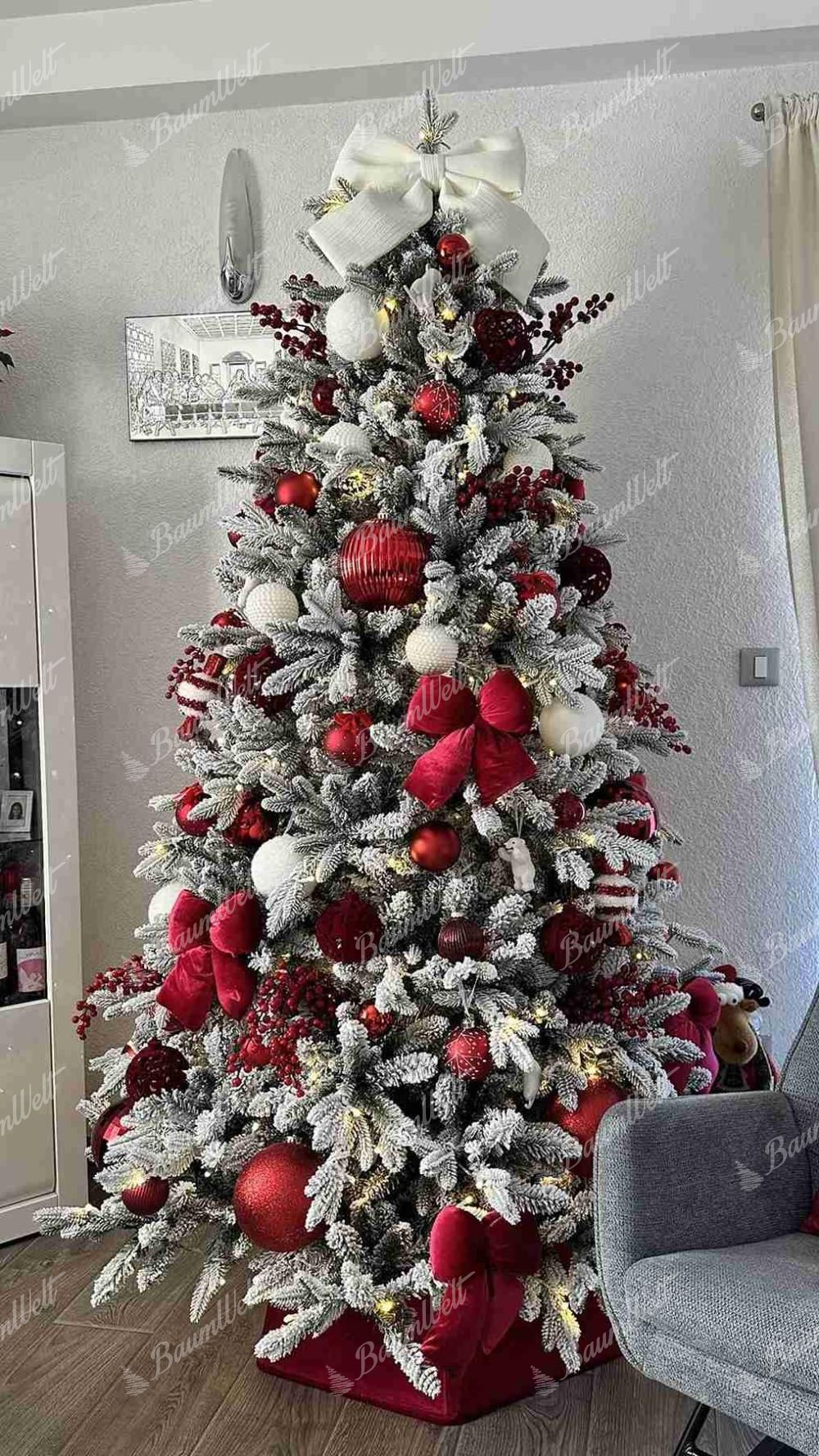 Die 3D-Zweige werden durch klassische PVC-Zweige, die mit Kunstschnee beschneit sind, ergänzt, wodurch der Baum dichter wirkt. Das neueste Anwendungssystem garantiert, dass kein Kunstschnee von den Bäumen fällt. Der Baum besteht aus einer festen, stabilen Eisenkonstruktion und wird mit einem Metallständer geliefert. Für die perfekte Form des Baumes sorgt ein Regenschirm-Faltsystem, das die einzelnen Zweige an eine vorbestimmte Stelle platziert.