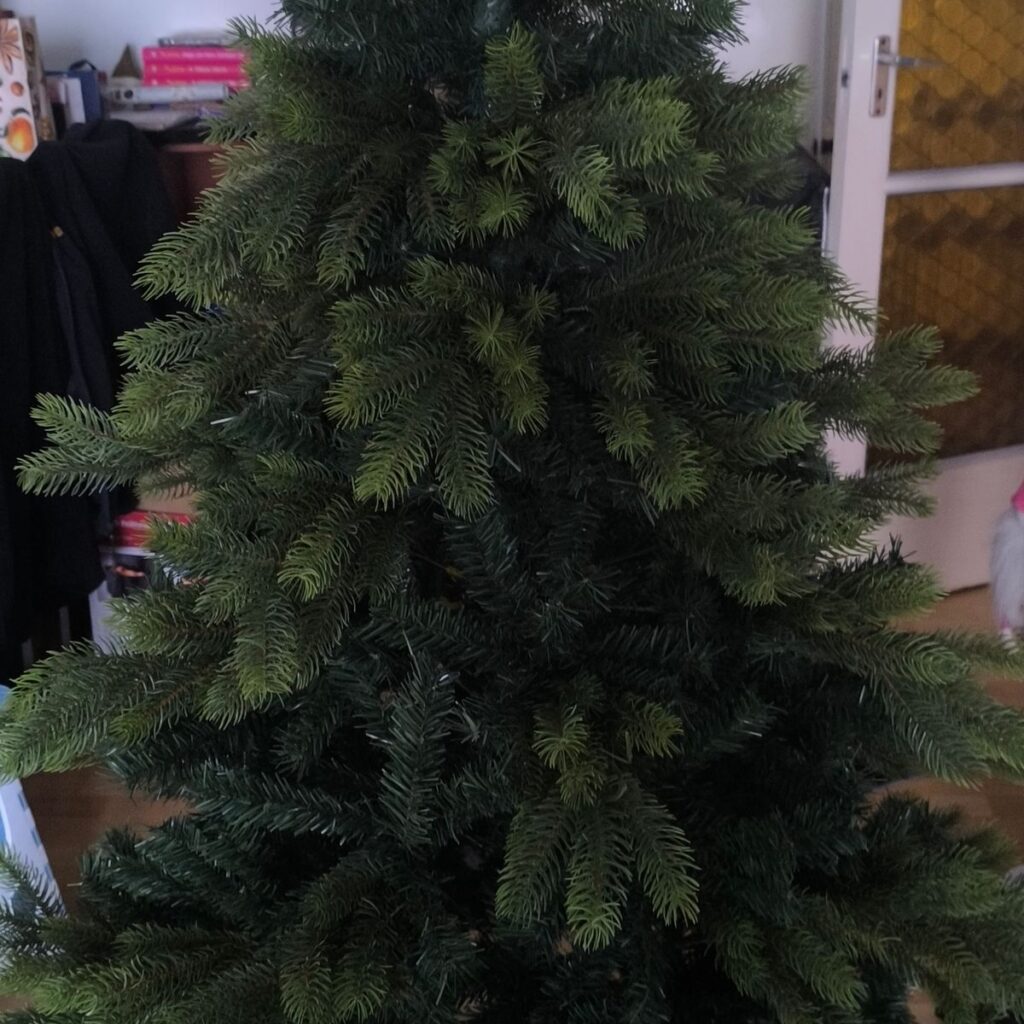 Die Mitte des Baumes ist mit klassischen, eher dunklen PVC-Nadeln verstärkt, wodurch er sehr dicht wirkt. Eine solche Farbkombination sieht sehr natürlich und realistisch aus.