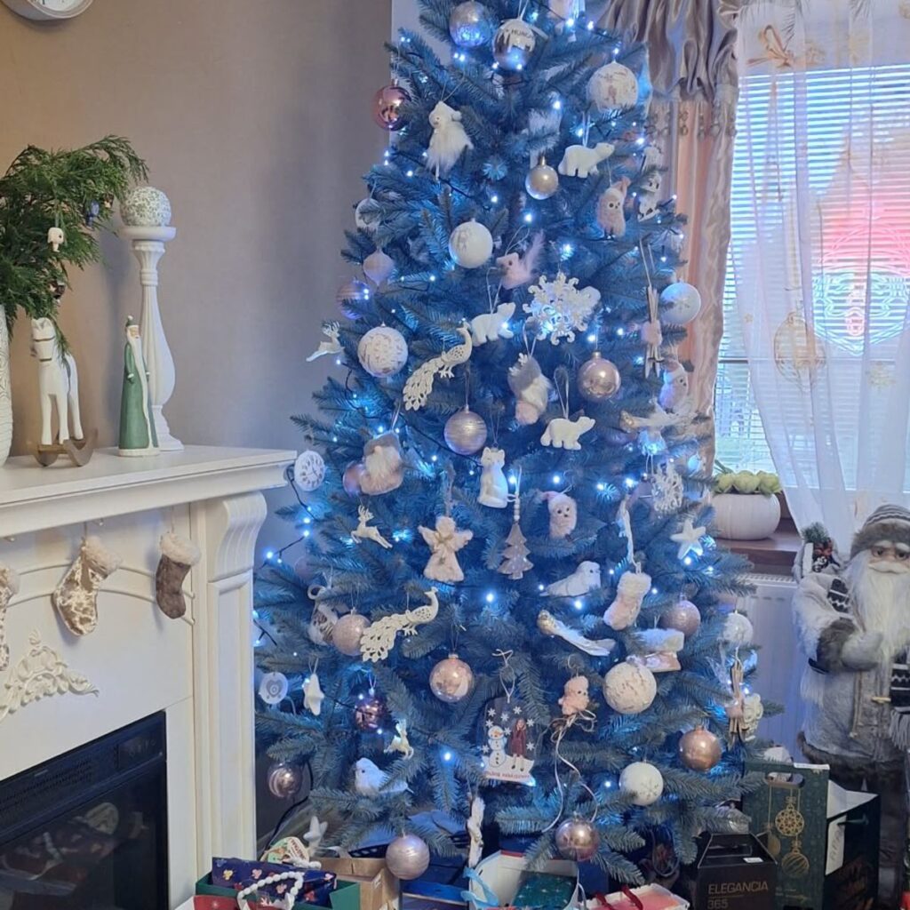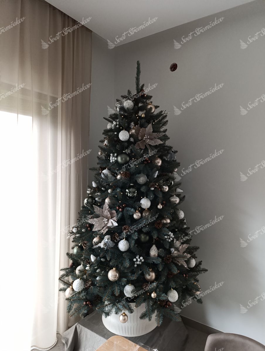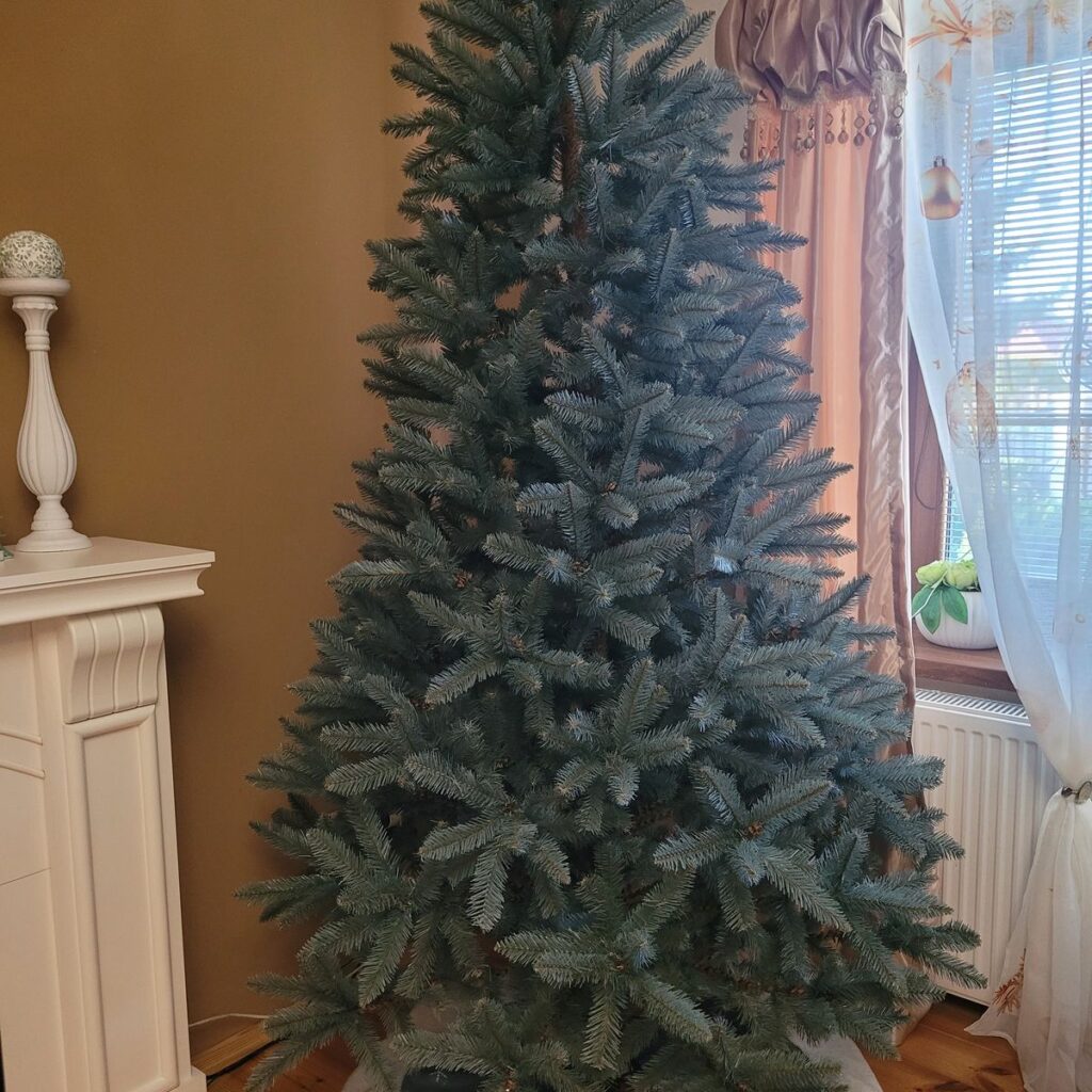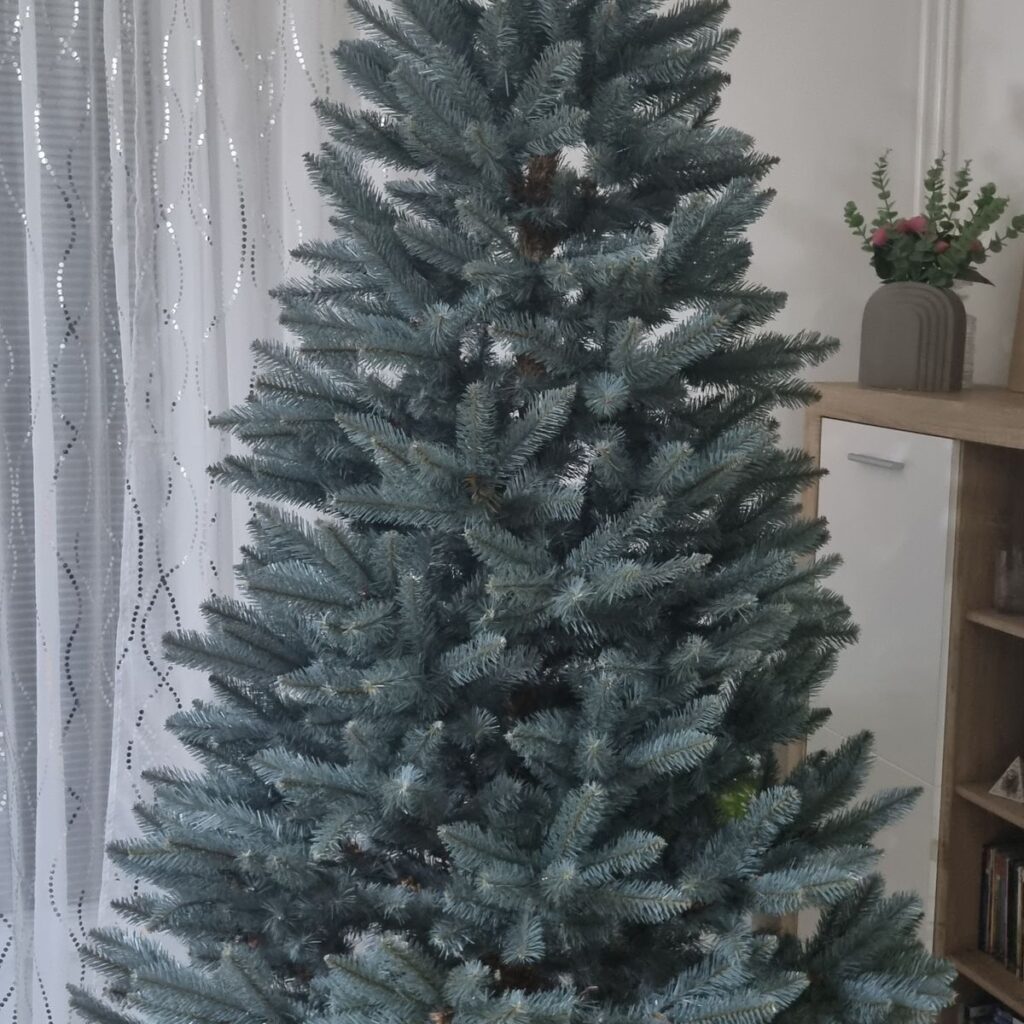 Der künstliche Weihnachtsbaum Silberfichte zeichnet sich durch seine schmalen PVC-Nadeln in türkis-silberner Farbe und einer Vielzahl von Zweigen aus. Hochwertige Eisenkonstruktion und ein stabiler Christbaumständer sind Teil der Verpackung.