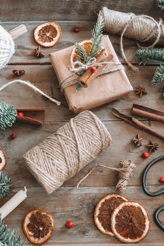 Die Basis ist einfaches braunes Kraftpapier. Es mag schlicht wirken, aber mit kleinen Details entsteht ein individueller Stil. Tannenzweige, Zapfen oder getrocknete Orangenscheiben und eine Schnur aus Jute verleihen dem Geschenk eine warme, natürliche Ausstrahlung.